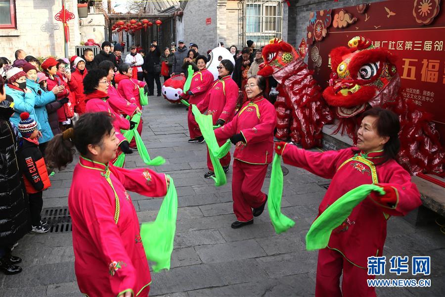 1月2日,市民和游客在北京市东城区前门街道草厂社区的胡同里观看舞狮和秧歌表演。新华社发(郭俊锋 摄)