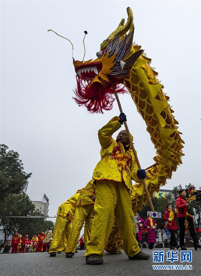 1月2日,湖北省宜昌市秭归县民间艺人在进行舞龙表演。新华社发(郑家裕 摄)