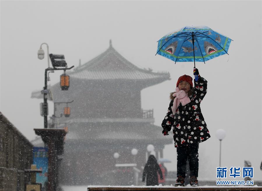 1月5日,一名小朋友在雪中的古城城墙上游玩。新华社发(郄磊 摄)