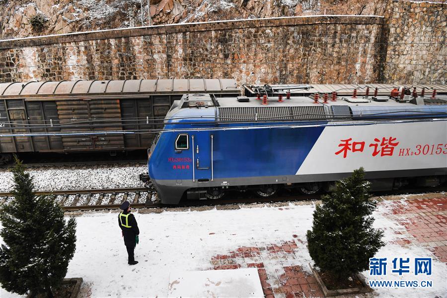 1月7日,青石崖车站助理值班员赵帅在接一列通过的客车,车站停靠着一列为客车让行的货车。 新华社记者陶明摄