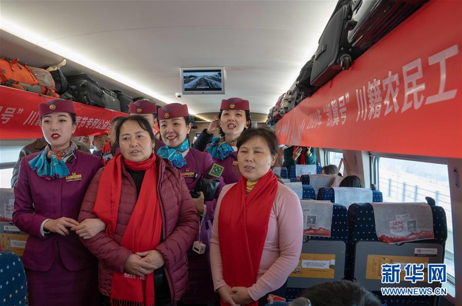 1月8日,在由北京西开往成都东的G307次“川籍农民工春节专列”上,乘务员和返乡农民工共同唱起《常回家看看》。 当日,一列由北京开往成都的“川籍农民工春节专列”从北京西站开出,载着700余名川籍农民工及家属返乡过年。此公益活动面向川籍农民工聚集的北京、上海、福建、江苏、江西,共征集约2400名川籍农民工及家属,分别从这5省市免费载他们返乡过年。 新华社记者 薛晨 摄