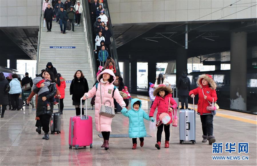 1月10日,几名小朋友在内蒙古呼和浩特东站站台准备上车。 当日,2020年春运正式启动,众多小朋友也踏上旅途。 新华社记者 朱文哲 摄