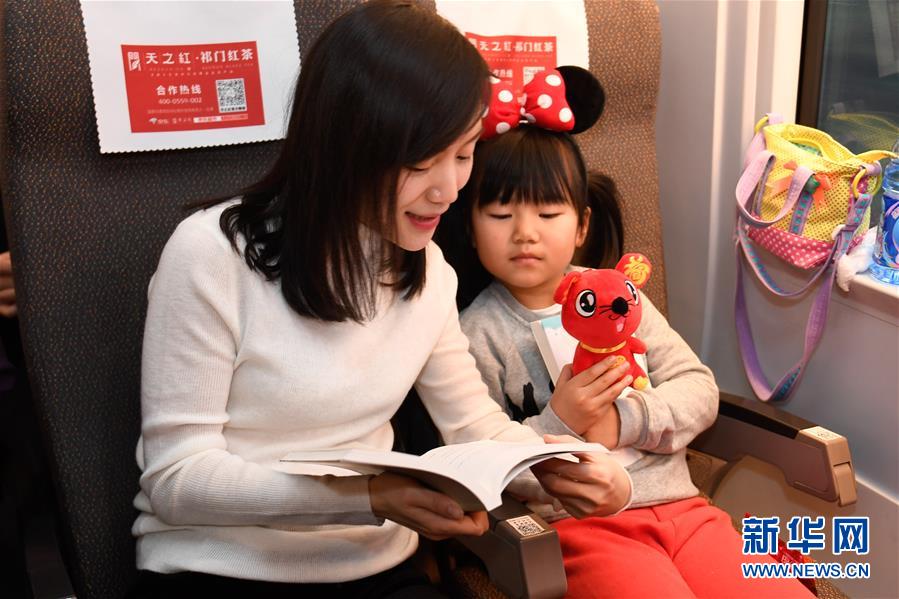 1月10日,在G20次列车上,一位旅客为女儿读书。 当日,2020年春运正式启动,众多小朋友也踏上旅途。 新华社记者 黄宗治 摄