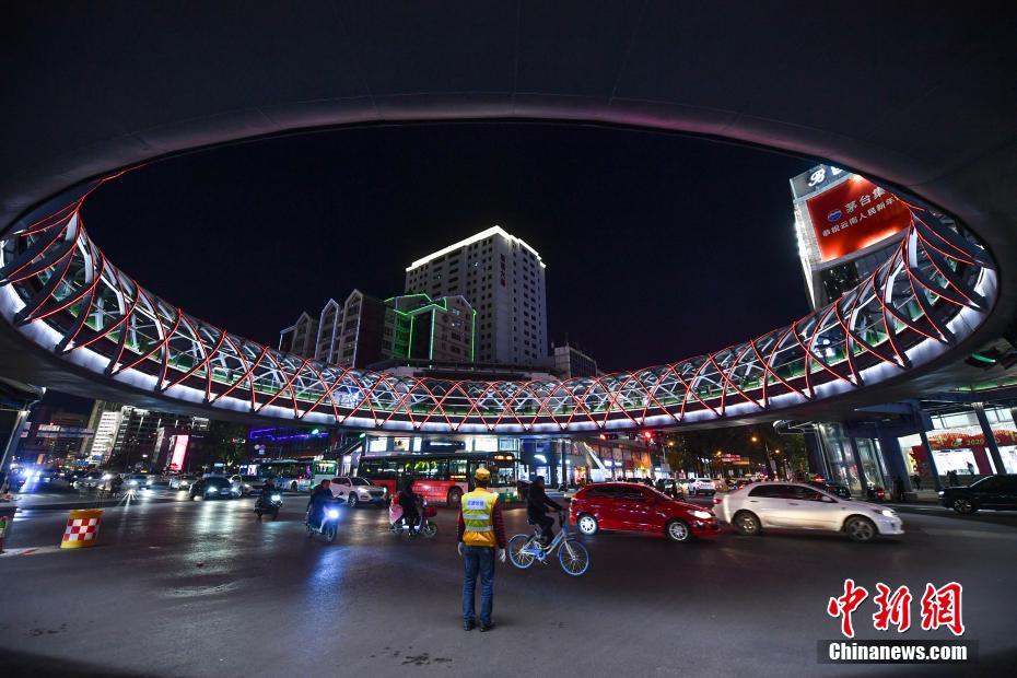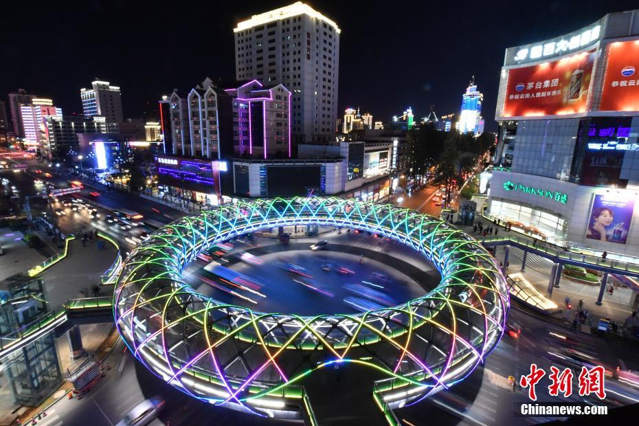 近日,昆明市首座环型天桥完工启用,其造型如同一个巨大的“甜甜圈”。图为1月9日晚,流光溢彩的环型天桥。 中新社记者 刘冉阳 摄