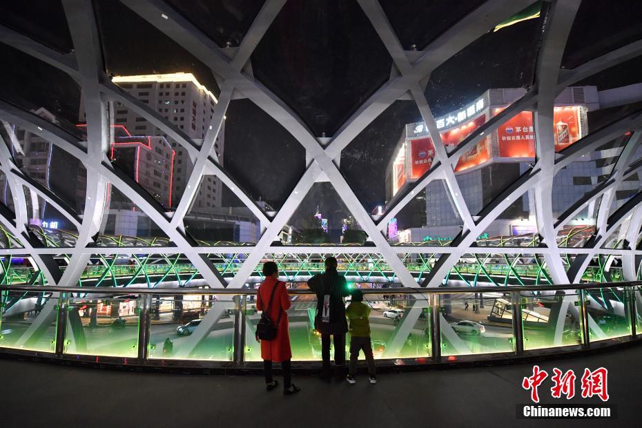 近日,昆明市首座环型天桥完工启用,其造型如同一个巨大的“甜甜圈”。图为1月9日晚,流光溢彩的天桥吸引市民拍照。 中新社记者 刘冉阳 摄