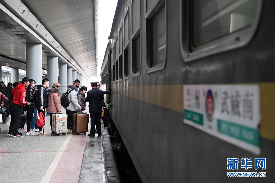 1月10日,旅客在兰州站排队登上由兰州开往武威南的7505次列车。 新华社记者 马宁 摄