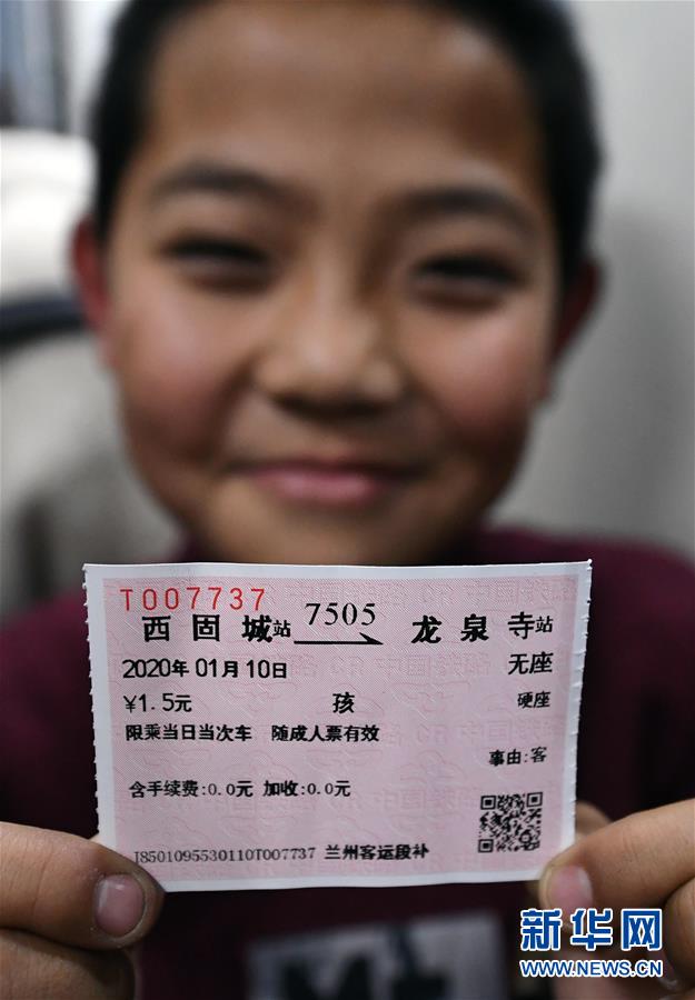1月10日,在由兰州开往武威南的7505次列车上,一名小朋友展示自己的车票,他的儿童票票价为1.5元。 新华社记者 马宁 摄