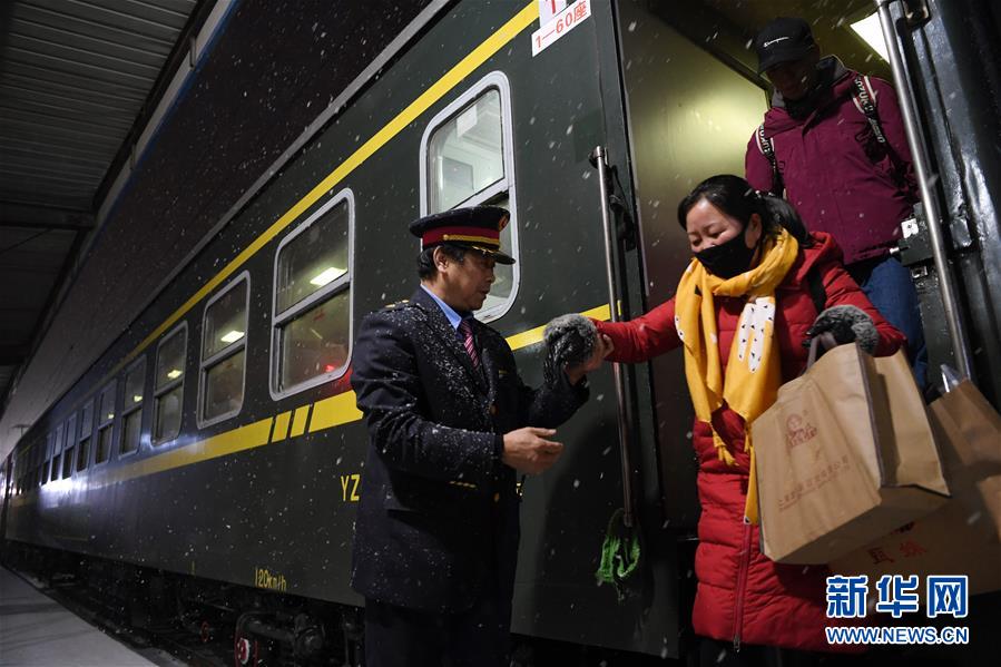 1月10日,由兰州开往武威南的7505次列车停靠在永登站,列车员邱述平冒雪帮助旅客下车。 新华社记者 马宁 摄