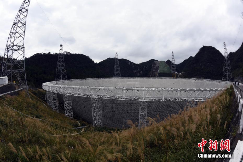 1月11日,当今世界最大的单口径射电望远镜、被誉为“中国天眼”的国家重大科技基础设施——500米口径球面射电望远镜(FAST),在位于贵州平塘的FAST台址顺利通过国家验收,正式开放运行。图为当天在FAST入口处拍摄的“中国天眼”。中新社记者 孙自法 摄