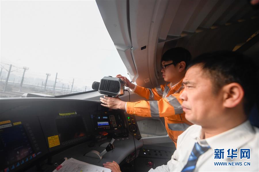 1月14日,中国铁路上海局集团有限公司杭州供电段巡检员葛烨(左)在高铁驾驶室安装接触网安全巡检装置。