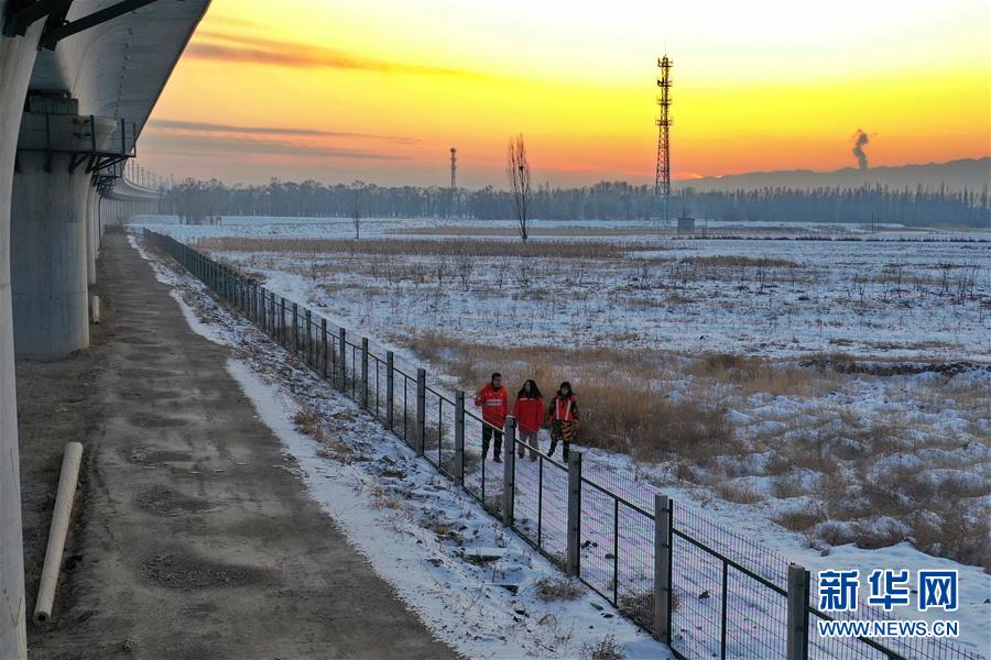 1月14日,谢晓静(右)跟着“师父”李玉平(左)检查铁路防护网(无人机照片)。新华社记者 曹阳 摄
