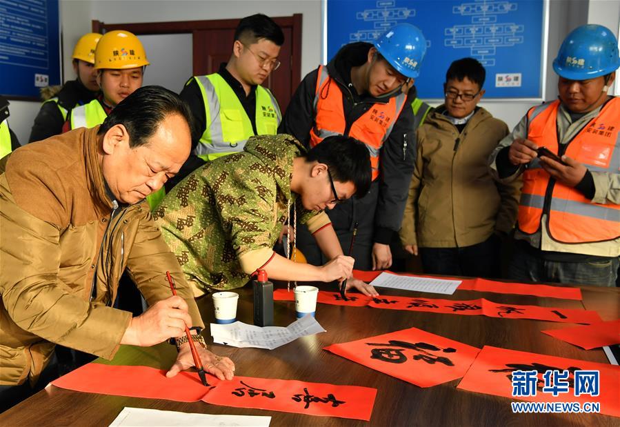 1月20日,社区组织书法爱好者为建筑工人书写春联。 当日,陕西西安新城区自强社区工作人员来到辖区的建设工地,为工人书写春联、福字,送去春节祝福。 新华社记者 刘潇 摄