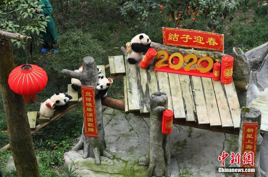 1月21日,重庆动物园两对7个月大的大熊猫双胞胎幼仔“双双”“重重”和“喜喜”“庆庆”用小竹篓背着“年货”,给已经37岁的“曾祖母”大熊猫新星拜年。已经37岁高龄的雌性大熊猫“新星”相当于人类的110多岁。它不仅是大熊猫界的“百岁老人”,也是现存最长寿的圈养大熊猫。因为年事已高,“新星”目前单独居住在重庆动物园熊猫馆一处僻静的小院子里,平常不对外正式展出。中新社记者 陈超 摄
