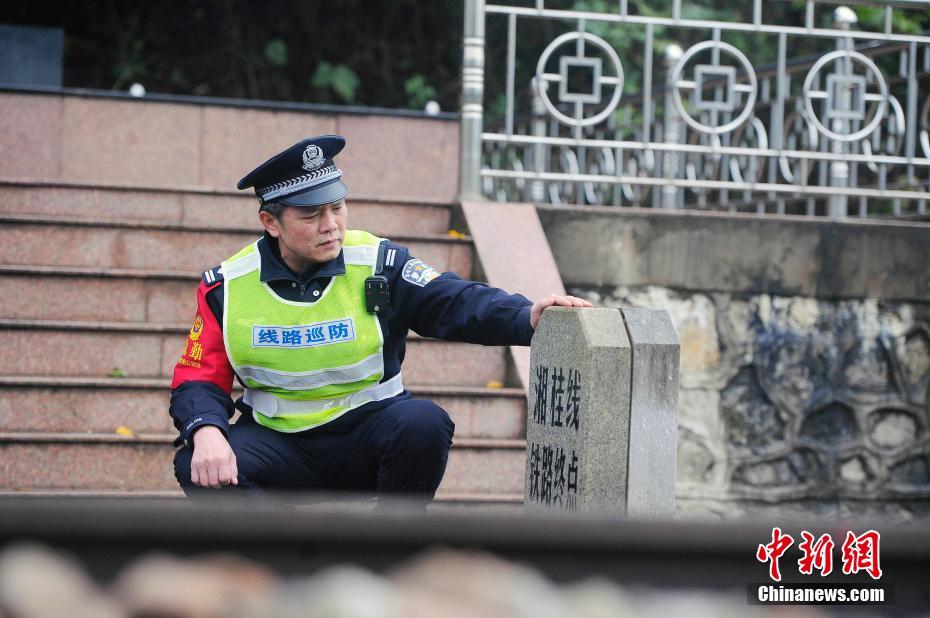 1月21日,广西南宁铁路公安处民警陆日峰巡查中越国际铁路广西凭祥火车站至中越边境边界路段。今年9月,陆日峰将退休,这是他的最后一个春运。中新社记者 蒋雪林 摄
