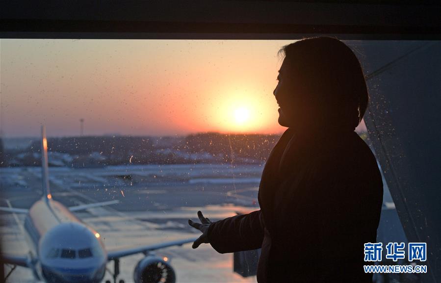 1月20日,在沈阳桃仙机场,陈玲眺望张天杨工作的飞机。新华社记者 杨青 摄