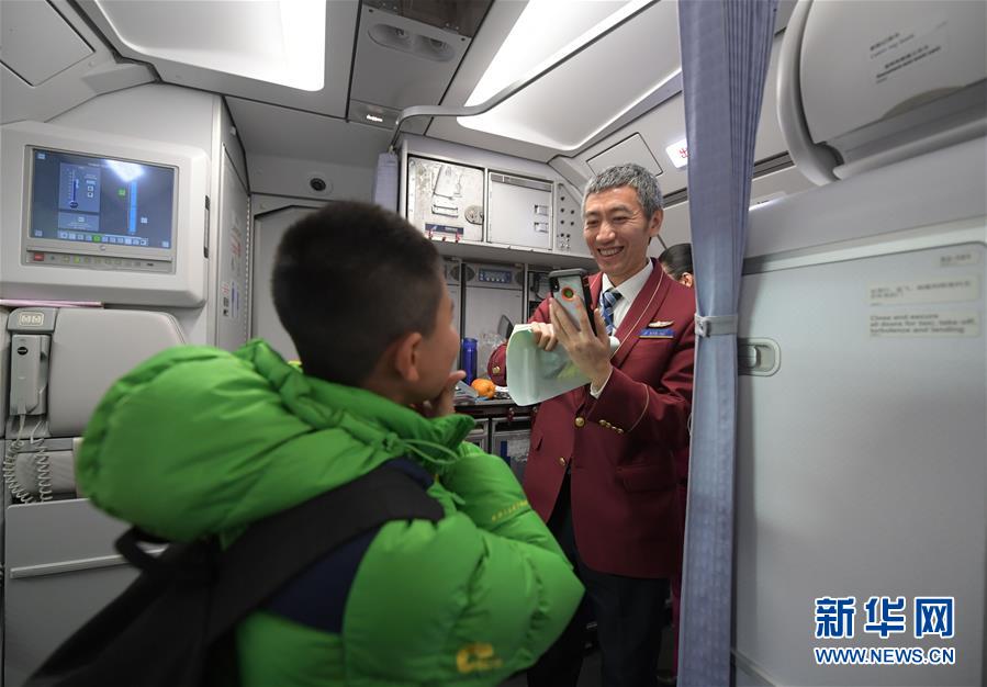 1月20日,在沈阳桃仙机场,张天杨给独自乘坐飞机的小朋友拍照。新华社记者 杨青 摄