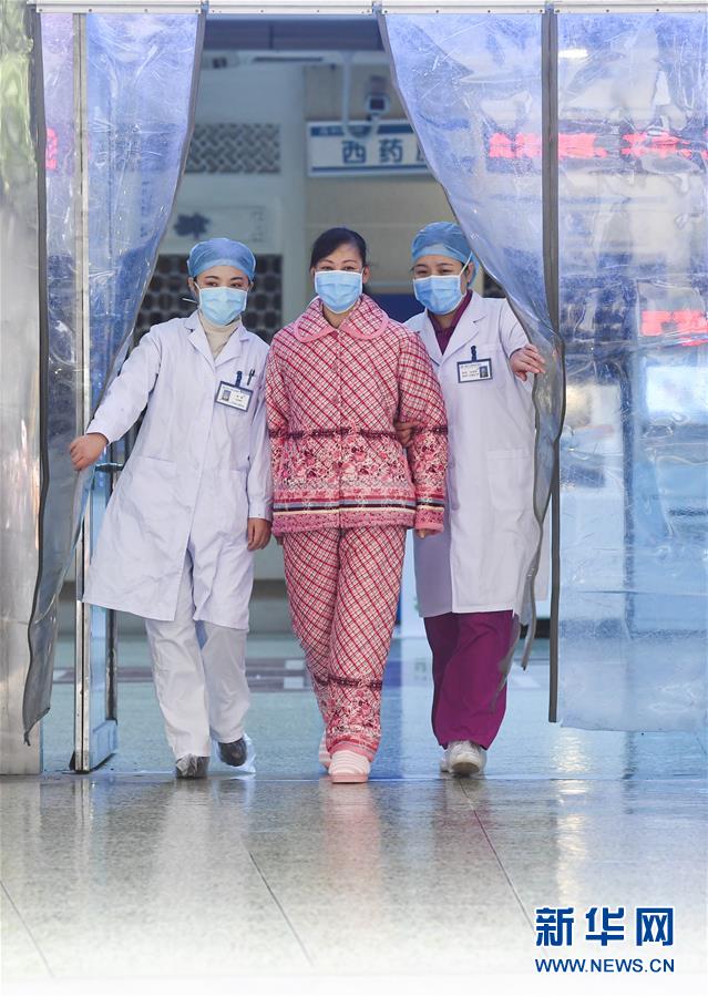 1月29日,在重庆三峡中心医院,黄霞(左一)和同事送治愈患者蒋某出院。这也是重庆市首例经过救治后成功治愈出院的新型冠状病毒感染的肺炎患者。新华社记者王全超摄
