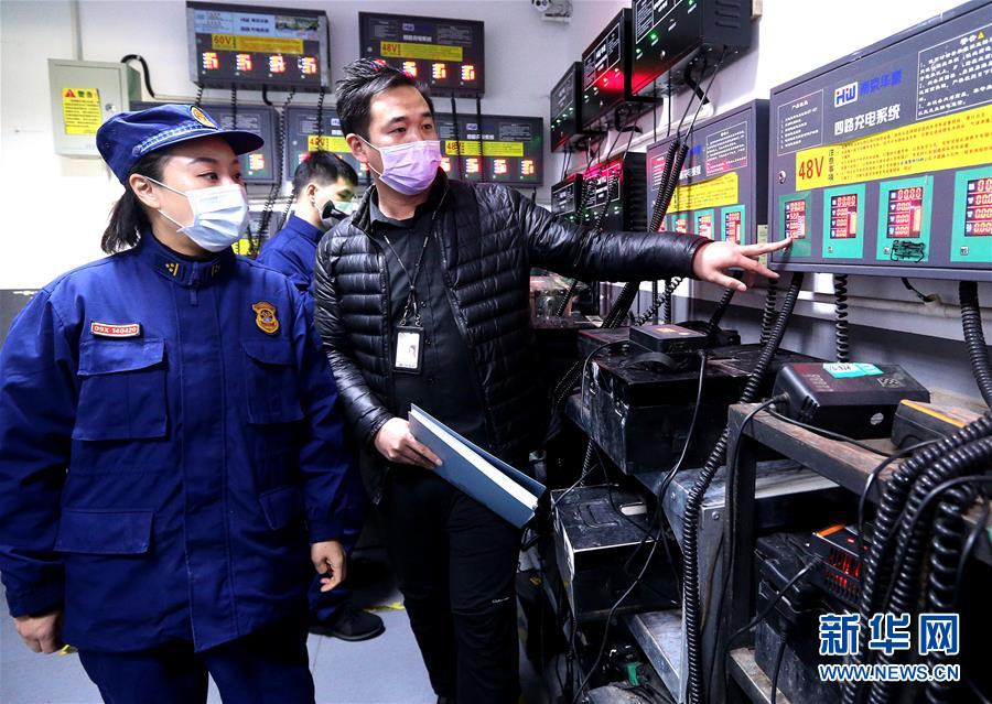 2月21日,消防人员在检查快递企业的蓄电池充电设备。 近日,上海市一些企业单位有序复工复产,上海市长宁区消防救援支队主动作为,对辖区内民生密切相关的企业进行安全生产消防指导,力保消防安全。 新华社记者 陈飞 摄