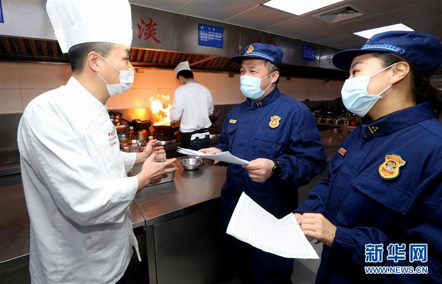 2月21日,消防人员在检查餐饮企业的消防安全环节。 近日,上海市一些企业单位有序复工复产,上海市长宁区消防救援支队主动作为,对辖区内民生密切相关的企业进行安全生产消防指导,力保消防安全。 新华社记者 陈飞 摄
