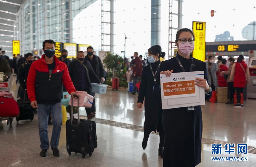当日下午,搭载145名四川省岳池县务工人员的MU2396航班从重庆江北国际机场起飞。这是重庆机场保障的首个市外复工返岗人员包机航班。据了解,此次航班由岳池县政府和宁波送变电建设有限公司共同组织,采用包车、包机的方式,将145名返岗员工送抵宁波。 新华社发