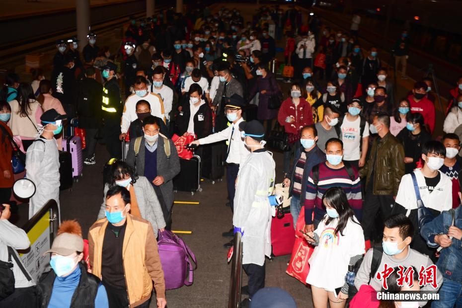 2月29日晚,由陕西来的320余名建设者乘坐G839次专列抵深返岗,深圳北站站台客运员、派出所警员、协警等疏导旅客有序出站。中新社记者 陈文 摄