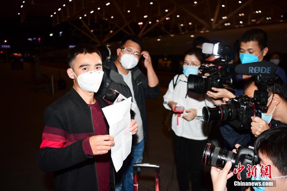 2月29日晚,由陕西来的320余名建设者乘坐G839次返岗复工专列抵达深圳北站。图为陕西汉中丁先生带着当地有关部门证明回到深圳,接受媒体记者采访。中新社记者 陈文 摄