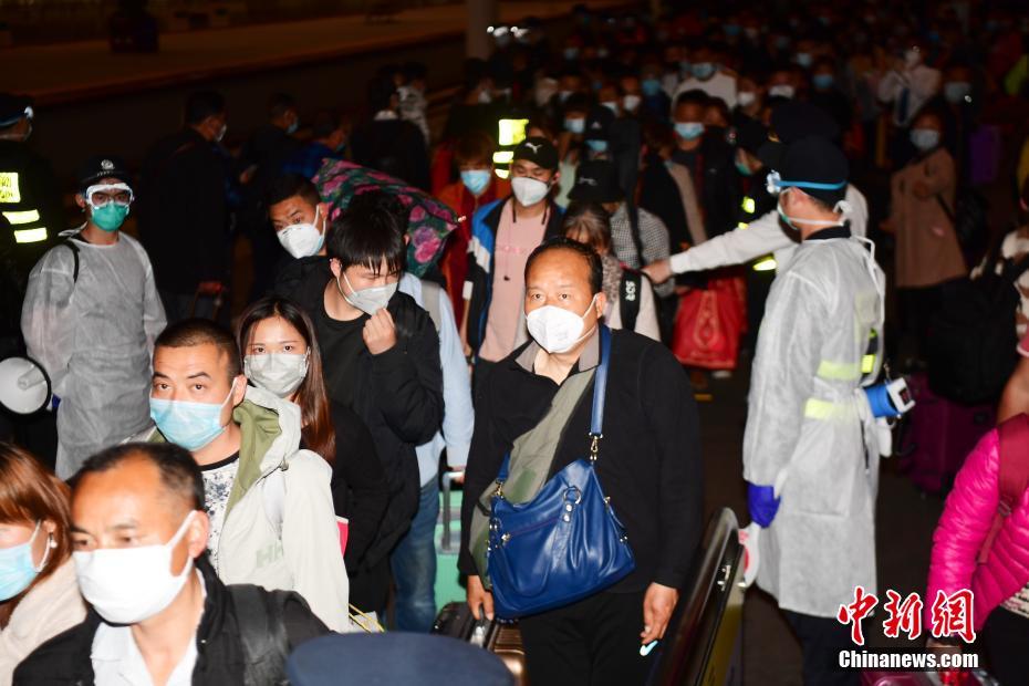 2月29日晚,由陕西来的320余名建设者乘坐G839次专列抵深返岗,深圳北站站台客运员、派出所警员、协警等疏导旅客有序出站。中新社记者 陈文 摄