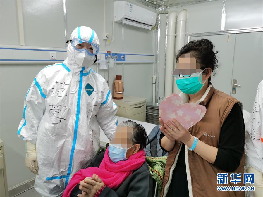3月1日,98岁的新冠肺炎危重症患者胡婆婆(坐轮椅者)和女儿出院时,与武汉雷神山医院医护人员合影(手机拍摄)。新华社发(高翔 摄)