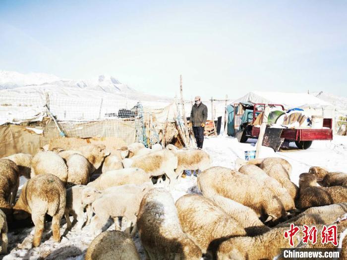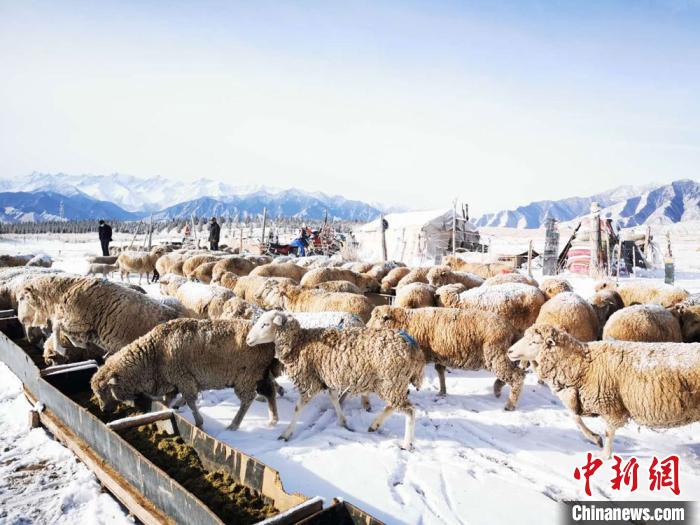 3月1日,雪域祁连山下的甘肃肃南裕固族牧民喂养羊群。 武雪峰 摄