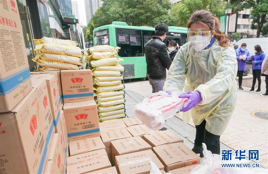 3月2日,武汉中百仓储的工作人员在武汉市江岸区球场街卸货。 新华社记者 程敏 摄