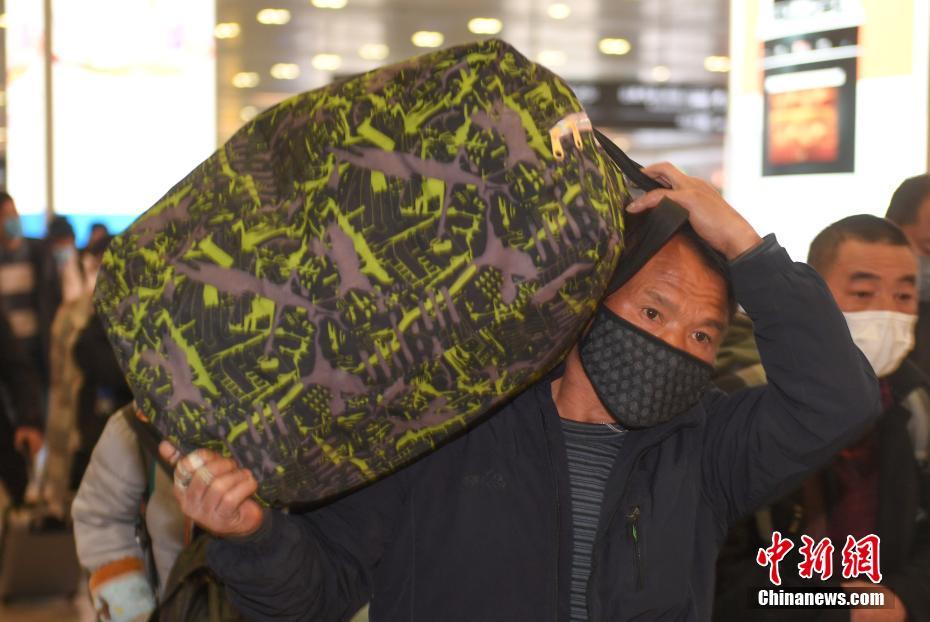 3月3日,一位复工人员扛着行囊走出杭州东站。春节以来,浙江已安排包车16000余辆、专列180余列、包机50余架,组织省外务工人员集中有序返程,截至3月1日累计接回员工49.7万人。中新社记者 王刚 摄