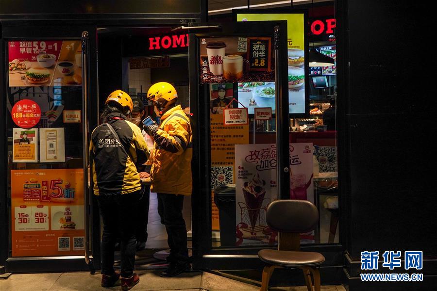 外卖小哥陈凯(右一)在南京油坊桥附近一处商家取餐(3月3日摄)。 新华社记者李博摄