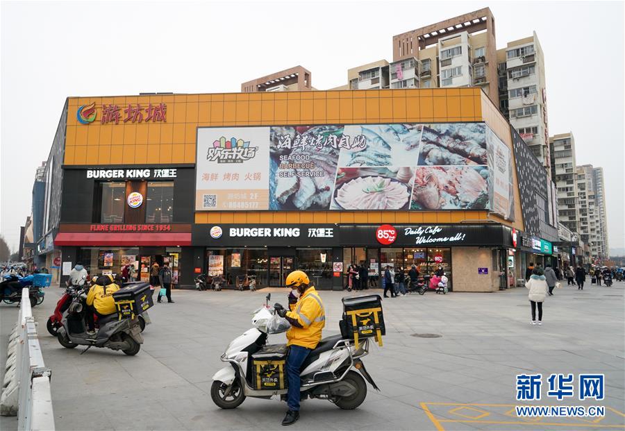 外卖小哥陈凯在配送商圈等待新的派送任务(3月3日摄)。 新华社记者李博摄