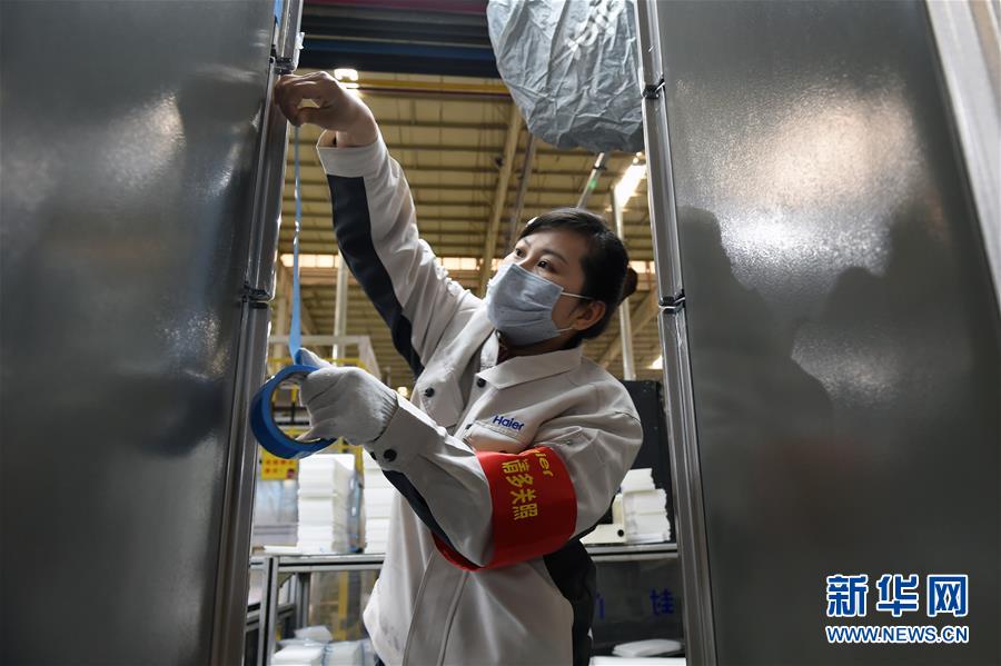 3月4日,在合肥海尔工业园,经过培训的“共享员工”在冰箱生产线上工作。 新华社发(周牧 摄)