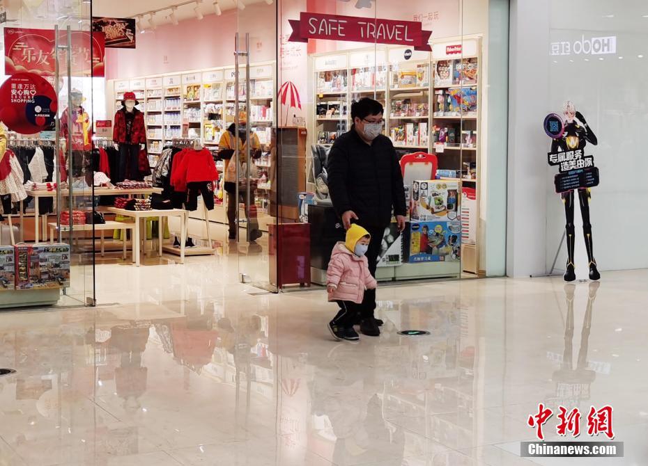 3月5日,河北石家庄一商场内的一对父女。据了解,目前石家庄市区已有20余家大中型购物中心、商场陆续恢复营业,但大部分只开放了一两个出入口。 中新社记者 翟羽佳 摄