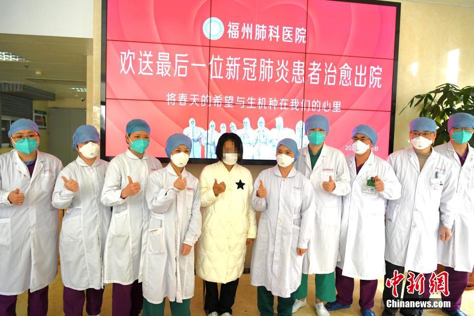 3月5日,福州市新增新冠肺炎确诊病例出院1例,累计治愈出院病例71例,目前无住院病例。自此,福州成为继龙岩、厦门后,福建省第三个确诊病例“清零”的设区市。图为出院患者林某某(中)与医护人员合影。 中新社记者 王东明 摄
