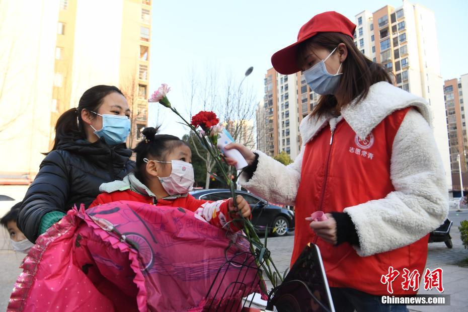 3月5日,大学生志愿者王束佳给进入小区的居民测量体温。在安徽省合肥市常青街道沿河社区,18岁的大学生王束佳主动报名参与街道的防控防疫志愿服务,和同事一起参与防疫宣传、跑腿、代购、消毒、值守等。在抗击疫情中,众多在校大学生主动加入志愿者队伍,助力社区防疫防控工作。 中新社记者 韩苏原 摄