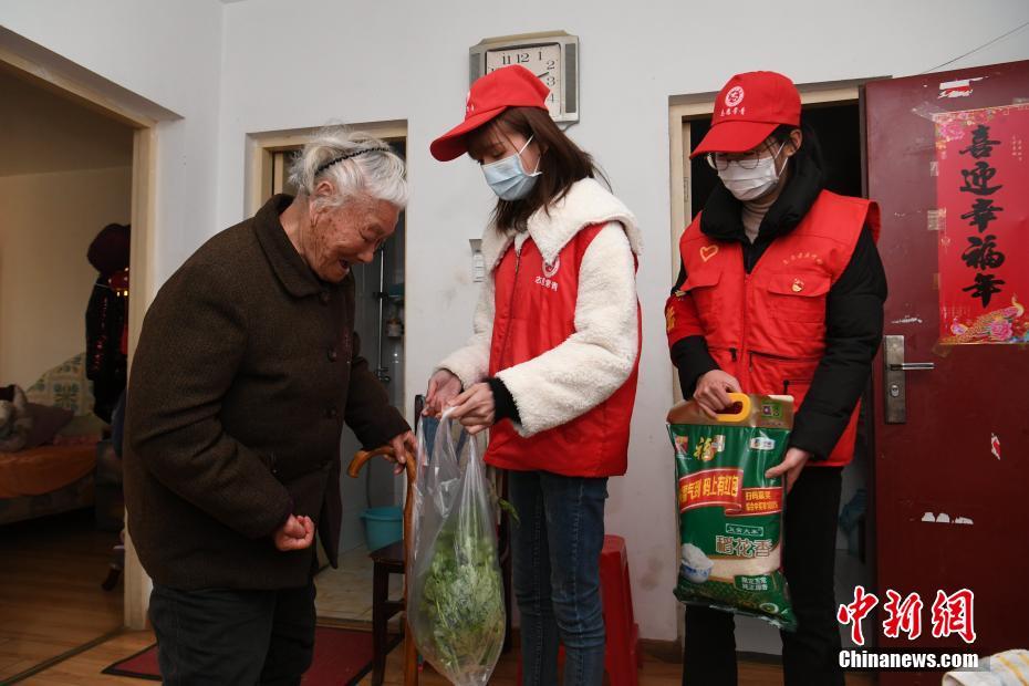 3月5日,大学生志愿者王束佳(中)和同事上门为高龄老人送去代购的蔬菜和大米。在安徽省合肥市常青街道沿河社区,18岁的大学生王束佳主动报名参与街道的防控防疫志愿服务,和同事一起参与防疫宣传、跑腿、代购、消毒、值守等。在抗击疫情中,众多在校大学生主动加入志愿者队伍,助力社区防疫防控工作。 中新社记者 韩苏原 摄
