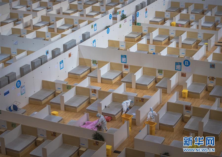 3月8日,工作人员在舱内进行清理作业。 当日,武汉体育中心方舱医院送走最后一批痊愈患者,正式休舱。随后,舱内将进行全面消毒工作。 新华社记者 肖艺九 摄