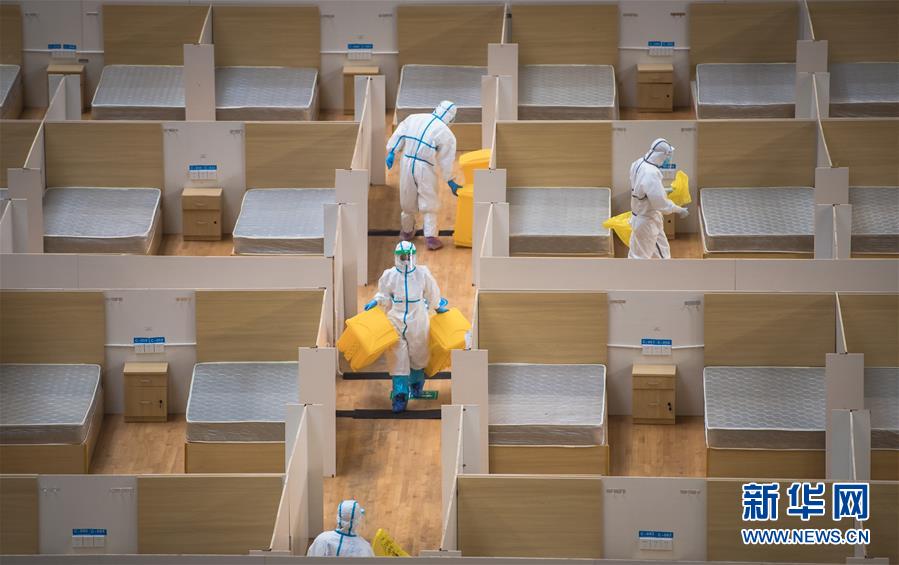 3月8日,工作人员在舱内进行清理作业。 当日,武汉体育中心方舱医院送走最后一批痊愈患者,正式休舱。随后,舱内将进行全面消毒工作。 新华社记者 肖艺九 摄