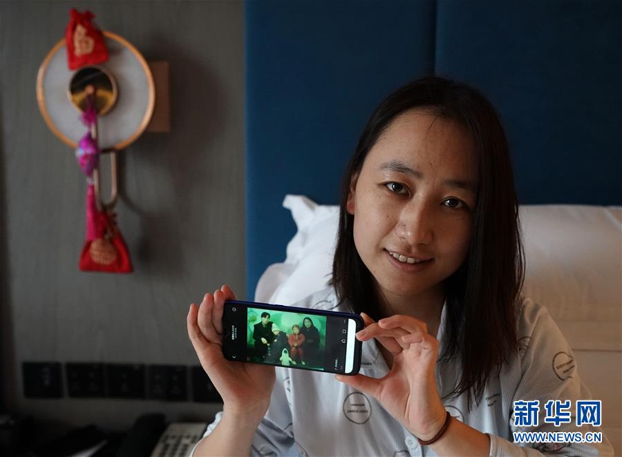3月12日,火神山医院感染三科一病区护士张颖展示小时候拍摄的“全家福”。 当日,记者走进武汉火神山医院感染三科一病区护士的驻地,探访她们的业余生活。新华社记者 王毓国 摄