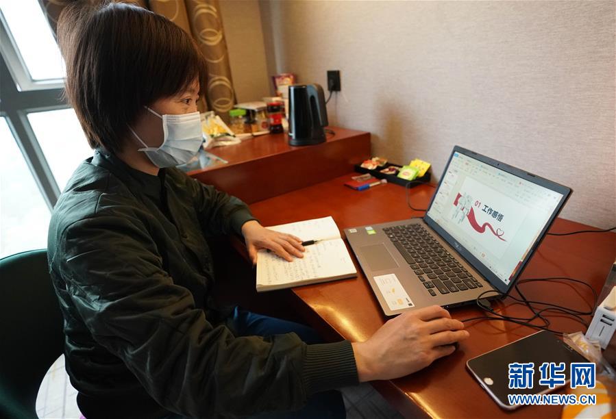 山医院感染三科一病区护士刘靖圆在分析采集库中“家病房”患者信息。 当日,记者走进武汉火神山医院感染三科一病区护士的驻地,探访她们的业余生活。新华社记者 王毓国 摄