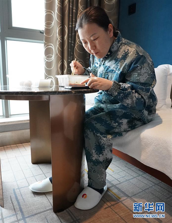 3月12日,火神山医院感染三科一病区护士吴妙玲在下夜班后吃早饭。 当日,记者走进武汉火神山医院感染三科一病区护士的驻地,探访她们的业余生活。新华社记者 王毓国 摄