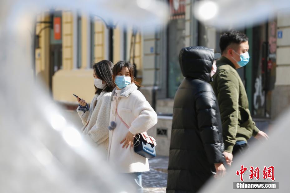 3月16日,黑龙江省哈尔滨市的民众行走在中央大街上。随着新冠肺炎疫情状况向好,民众的生活渐归常态,哈尔滨中央大街人流逐渐增多。 中新社记者 吕品 摄