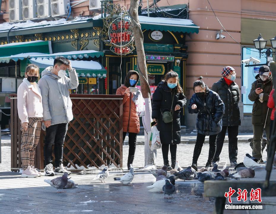 3月16日,黑龙江省哈尔滨市中央大街上的鸽子吸引民众驻足观看。随着新冠肺炎疫情状况向好,民众的生活渐归常态,哈尔滨中央大街人流逐渐增多。 中新社记者 吕品 摄