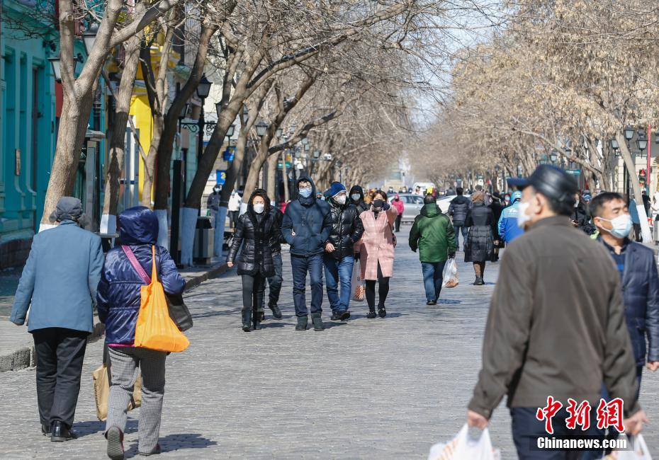 3月16日,黑龙江省哈尔滨市的民众行走在中央大街上。随着新冠肺炎疫情状况向好,民众的生活渐归常态,哈尔滨中央大街人流逐渐增多。 中新社记者 吕品 摄