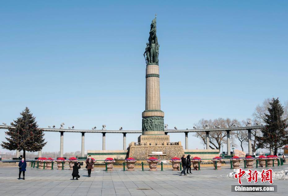 3月16日,黑龙江省哈尔滨市的民众在防洪纪念塔前拍照。随着新冠肺炎疫情状况向好,民众的生活渐归常态,哈尔滨中央大街人流逐渐增多。 中新社记者 吕品 摄