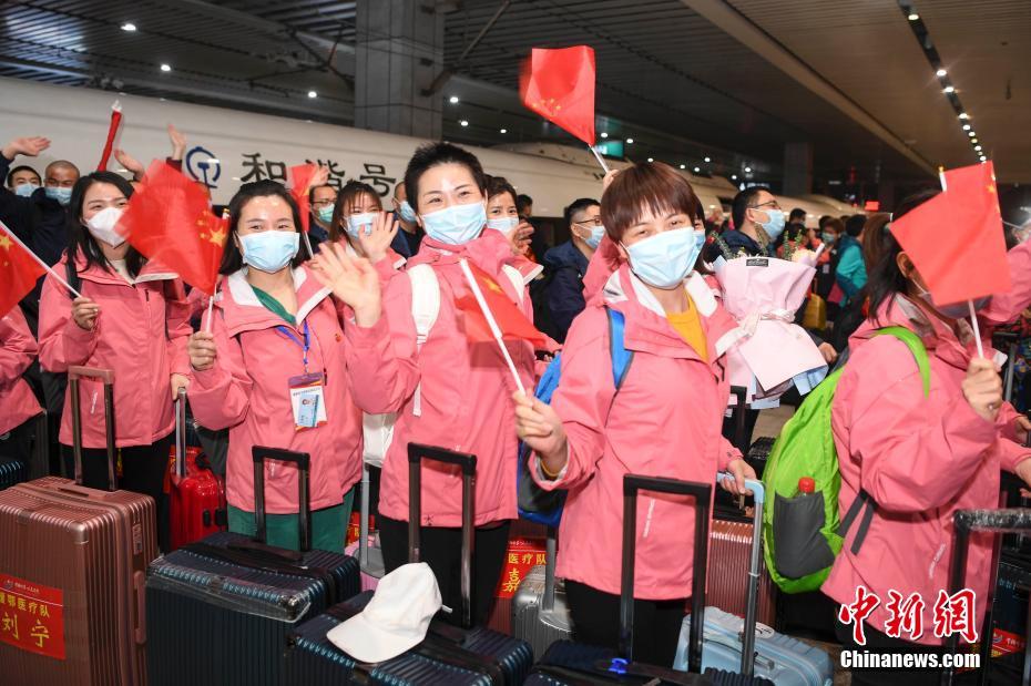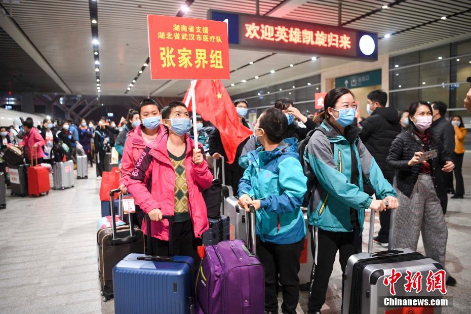 3月17日,医护人员挥手致意。当晚,湖南支援湖北抗“疫”的4批医疗队219名队员乘坐汽车与高铁等交通工具抵达湖南,平安返程。中新社记者 杨华峰 摄