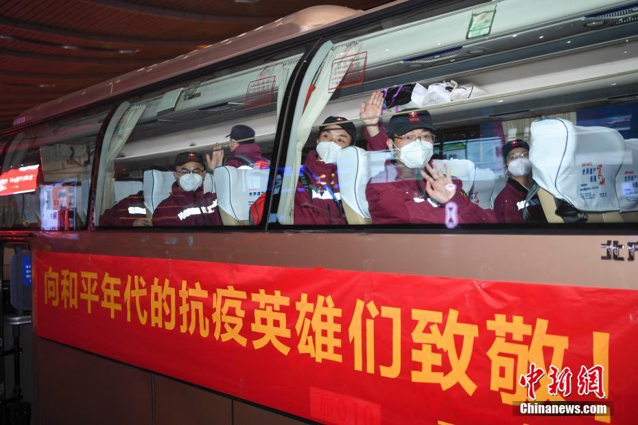 3月17日,医护人员挥手致意。当晚,湖南支援湖北抗“疫”的4批医疗队219名队员乘坐汽车与高铁等交通工具抵达湖南,平安返程。中新社记者 杨华峰 摄