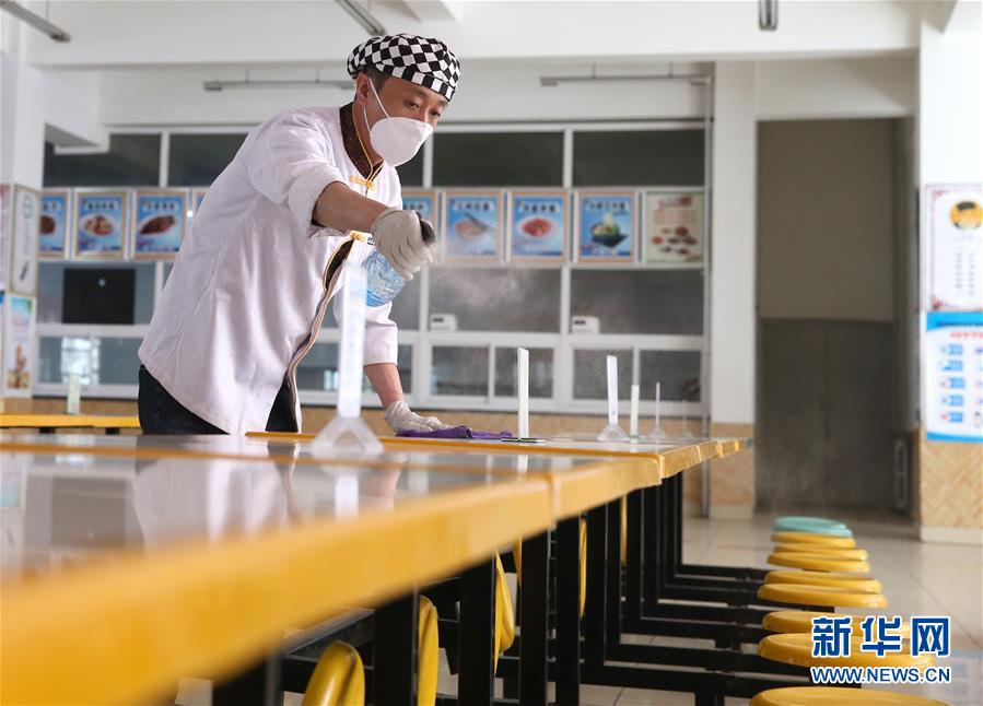 3月21日,银川市第二中学食堂工作人员对食堂餐桌进行消毒。新华社记者 贾浩成 摄